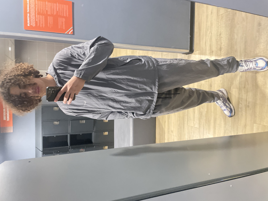 An individual is depicted taking a mirror selfie inside what appears to be a locker room at a Basic-Fit gym in Hérouville-Saint-Clair, France. The person, with curly brown hair, is wearing a grey athletic tracksuit featuring a full-zip hooded jacket with a white Nike swoosh on the left chest and matching track pants with a visible black drawstring. They are also wearing white, blue, and purple athletic shoes, identifiable as Asics brand. The individual holds a dark-colored smartphone with both hands, positioned to capture their reflection. The immediate environment consists of a light-colored wood laminate floor and a mirror that reflects the locker room. Behind the individual's reflection, multiple dark grey metal lockers are visible, some with open doors. A light grey bench is situated in front of the lockers. On the right wall, an orange rectangular sign with white French text is reflected, displaying "RÈGLEMENT INTÉRIEUR" (Internal Regulations), "UTILISATION DES INSTALLATIONS" (Use of Facilities), and "OBLIGATOIRE" (Obligatory), consistent with the signage found in Basic-Fit fitness centers, such as the one at Centre Commercial Saint-Clair, 175 Rue Saint-Clair, 14200 Hérouville-Saint-Clair.