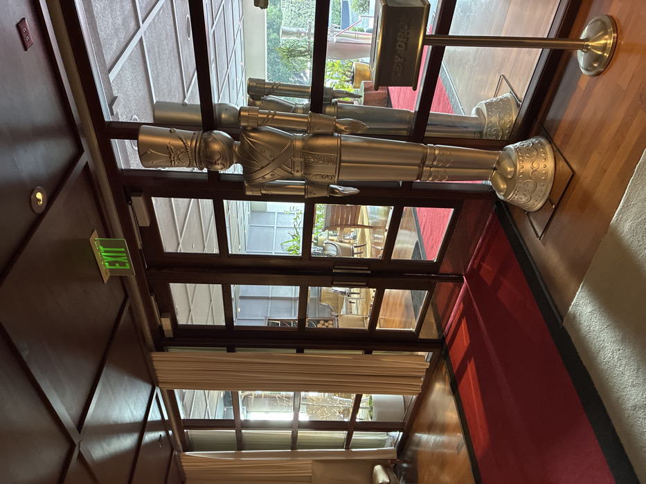 - "A silver statue of a nutcracker stands in front of glass doors leading to an outdoor patio area with chairs and greenery" by FM-1neqH3, licensed under CC BY 4.0