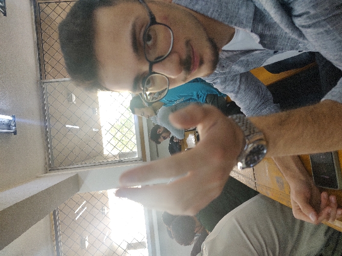 The scene depicts an interior view of a classroom or lecture hall, located in Ash-Shaghour Municipality, Syria. The image is taken from a first-person perspective, primarily featuring a young adult male in the foreground on the right. This individual has short dark hair, a light mustache and stubble, and wears dark-rimmed glasses. He is dressed in a grey hooded sweatshirt over a white t-shirt. His left arm is raised, with a silver-toned wristwatch, featuring a metal link band and a dark face, visible on his wrist. A dark-colored smartphone is present on the wooden desk surface in front of him. In the mid-ground and background, multiple other young adult males are seated at long, yellowish-brown wooden desks with yellow seating structures. One male in a light blue top is partially visible behind the foreground subject. Further back, another male in a grey shirt is seen leaning over a desk. The room features large windows in the background, covered by a diamond-patterned metal security grille, allowing natural light into the space and revealing faint green foliage outside. Fluorescent tube lights are mounted on the light-colored ceiling. The overall environment suggests an educational or group study setting during daylight hours.