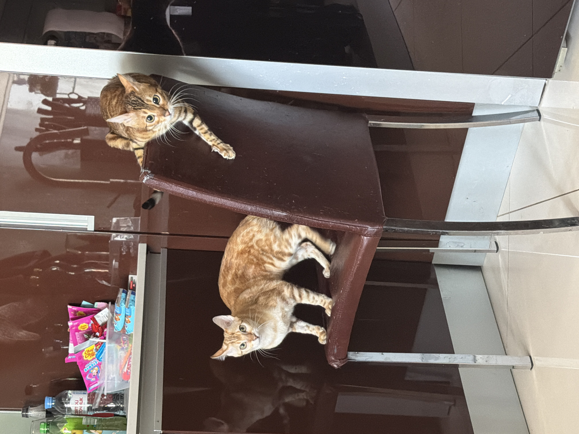 Two cats are sitting on a chair. One cat is brown with stripes and is on the top of the chair. The other cat is orange with stripes and is on the bottom of the chair. The chair is brown with a silver frame. The chair is located in a kitchen in Vsevolozhsk, Russia. A cupboard is in the background filled with candy and water bottles.