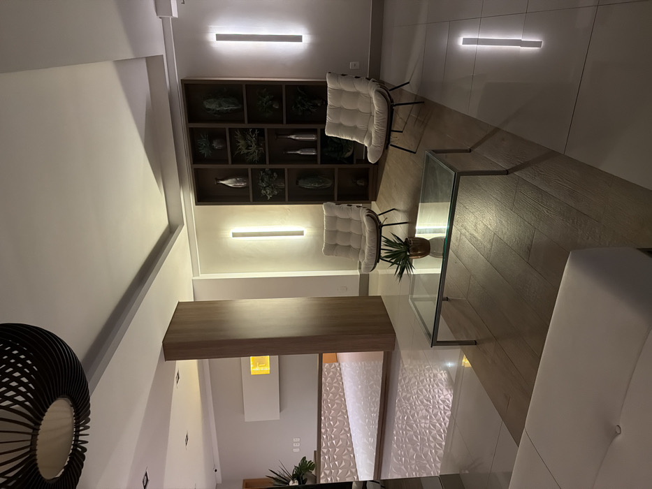 A contemporary living space features a dark brown shelving unit with decorative objects, flanked by two white cushioned chairs with black frames. A clear glass coffee table sits on hardwood flooring with a potted plant atop. The room is illuminated by linear LED lights. A wooden partition leads to an area with textured white wall panels and another plant. A black, circular decorative piece is visible in the foreground.