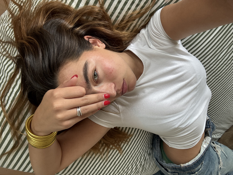 The image depicts a female individual lying supine on a bed within an unidentifiable indoor setting in the city of Los Angeles, United States of America. The bed is covered by a sheet with alternating diagonal stripes of dark olive green and light beige. The individual has long, wavy dark brown hair with lighter highlights, spread around her head. Her left arm is raised, with her hand positioned to partially cover her forehead and left eye. Her fingernails are painted red. She wears approximately seven to eight gold-colored bangles on her left wrist, a silver-colored multi-band ring on her left ring finger, and a small silver hoop earring in her left earlobe. She is dressed in a white, short-sleeved, crew-neck t-shirt and blue denim jeans. The jeans are unbuttoned and partially unzipped, exposing the top of a green undergarment. Her visible right eye is green or hazel, and her face shows a light complexion with subtle freckling on the cheeks. Her gaze is directed towards the camera.
