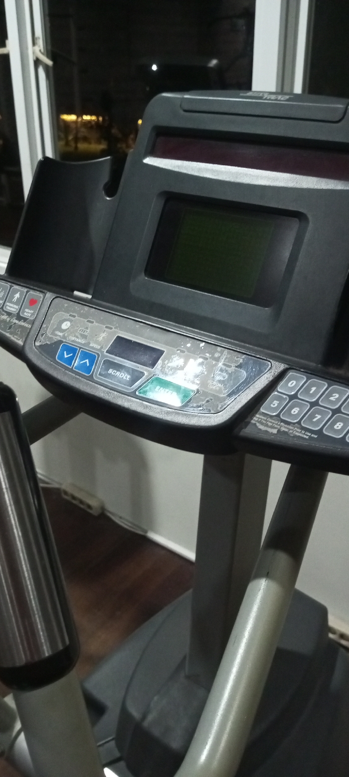 The image displays an indoor scene at night, located in a facility or room within Pacet, Indonesia. The primary subject is the control panel of a "MATRIX" brand treadmill, viewed from a slightly elevated, angled perspective. The console is dark grey/black, featuring a central rectangular screen that appears unlit and green-tinted. Below this screen, a control interface includes a "SCROLL" button, a prominent green "ENTER" button, and blue up/down arrow buttons. A numerical keypad (0-9) is positioned on the right side of the panel. The surface of the control panel exhibits visible wear, including what appears to be dried residue or minor surface damage across the button area. In the background, a window reveals a dark exterior with faint, distant yellow lights, confirming the nighttime setting. Below the console, sections of the treadmill's grey support structure are visible, along with a dark wooden floor, a white baseboard, and a white power strip connected to an outlet on the adjacent wall. No individuals are present in the image, and no specific actions or interactions are depicted.
