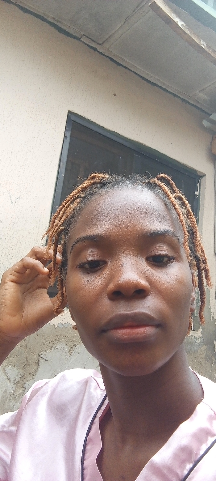 The image displays a close-up portrait of a single individual, described as being located in Nassarawa, Nigeria. The subject is a young adult female with dark skin, directly facing the viewer with a neutral facial expression, looking slightly downwards. Her hair is styled in short, light brown or reddish-brown dreadlocks or twists, with darker roots visible at the scalp. She is wearing a light pink garment, possibly satin, with dark piping along the collar or lapel. Her left hand is raised, with fingers gently touching the hair near her left ear. The background features a textured, light beige wall, partially obscuring a dark-framed window behind the subject's head. Above the wall and window frame, a grey, paneled ceiling or soffit structure is visible. The scene is illuminated by natural, diffused light.