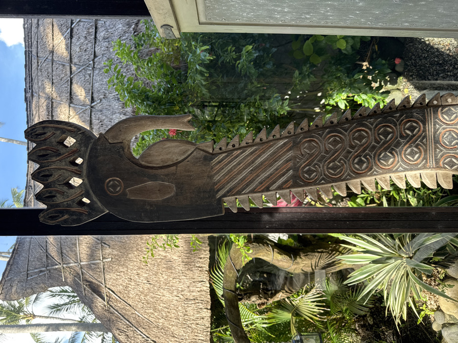 The image displays a vertically oriented, elaborately carved wooden totem or sculpture in the city of Tibubiyu, Indonesia, positioned in what appears to be a doorway or framed opening. The sculpture, dark brown with lighter carved details, features a stylized bird-like head at the top, characterized by an elongated, downturned beak and a five-pointed crown with internal cutouts. Its elongated body has a sawtooth-patterned left edge and intricate carvings across its surface: diagonal stripes in the upper section and multiple rows of repeating S-shaped scroll patterns enclosed in diamond/square motifs in the lower section. The background reveals a vibrant outdoor tropical environment. To the left of the sculpture, a large, conical thatched roof structure is partially visible, indicating traditional Indonesian architecture, beneath a clear blue sky with visible palm trees. Lush green foliage, including variegated succulent plants and other tropical trees, grows near the base of the roof structure. To the right of the sculpture, dense green bushes and trees with small red blossoms are visible, alongside a light-colored wooden door or panel with a dark hinge. The ground cover in the outdoor areas consists of dark soil, rocks, and small stones. The scene is brightly illuminated by natural daylight. No individuals are present in the image.