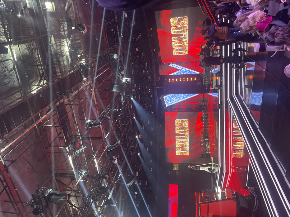 A tilted view captures a stage setup with a colossal lighting rig above, featuring numerous spotlights and metal framework. Two large screens display "CHILLS" in golden letters on a red background, flanking a blue starry display. On the stage, performers and audience members are visible, their figures partially obscured. White stripes create a visual effect leading towards the stage, complementing the vibrant colors of the set.