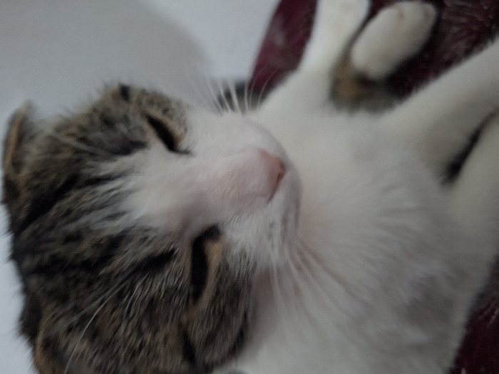 A close-up image depicts a domestic cat with a white and tabby fur pattern, resting indoors. The cat's head, facing slightly downwards and to the right, features distinct brown and black tabby markings across its crown and ears, contrasting with its white facial fur. Its eyes are nearly closed, indicating a state of rest or drowsiness. A pink nose and prominent white whiskers are visible. The cat's body is largely white, with a small patch of brown/grey fur visible on its right front leg, which is partially extended forward. The feline is situated on a dark reddish-brown, textured surface, likely fabric, which fills the lower portion of the frame. The background behind the cat is out of focus and appears to be a light, indistinct wall or surface. No specific location within Khujayli, Uzbekistan, is discernible from the visual evidence. No human subjects or discernible interactions are present.