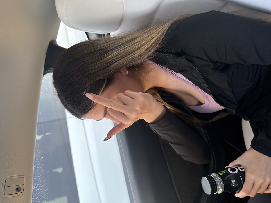 A female subject is depicted seated within the passenger compartment of a vehicle, in Rosh Haayin, Israel. The subject, seen from the mid-chest upwards, has long, brown hair with lighter ends. She wears a black, partially unzipped athletic jacket over a light purple top, and a silver stud earring in her right ear. Her right hand is raised, performing a gesture where the index and pinky fingers are extended, and the middle and ring fingers are curled, commonly known as "devil horns" or "rock and roll" sign. Her fingernails are long, pointed, and feature a nude base with black, patterned tips. Her left hand holds a dark-colored plastic bottle with a black cap, displaying an orange logo. The vehicle interior shows a white headrest, black door trim, and a window reflecting a blurred white exterior.