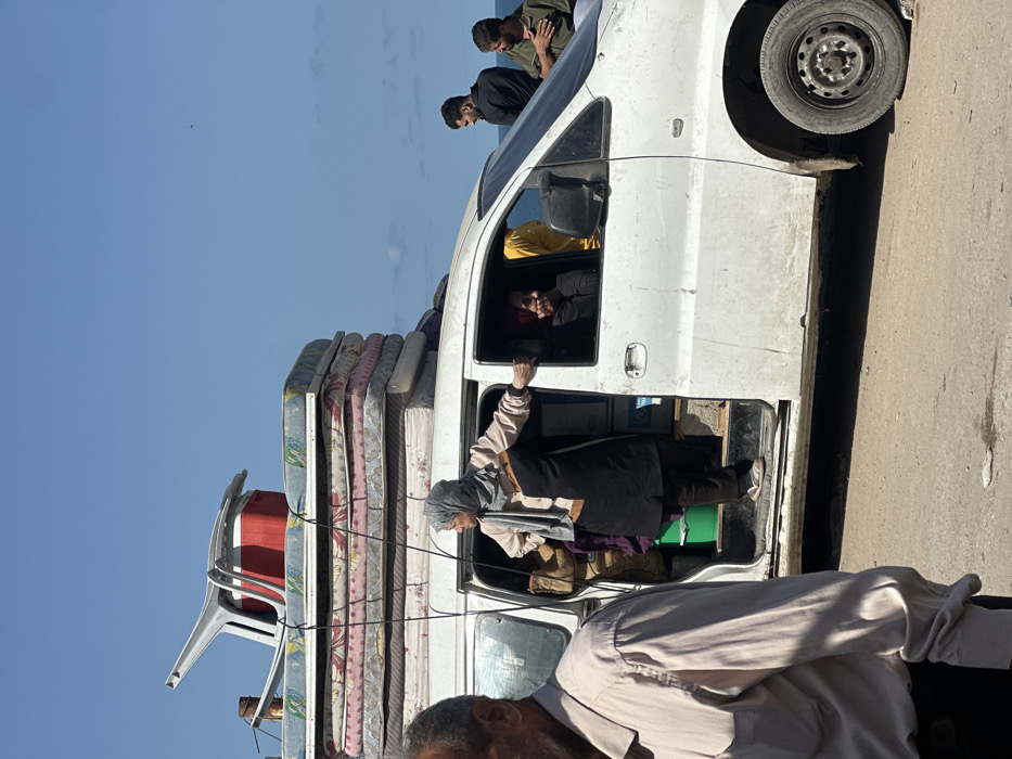 - "The image depicts an outdoor scene in Jazirat an Nasirat, featuring a white van heavily loaded with possessions, parked on a dirt and asphalt surface adjacent to a body of water under a clear blue sky" by FM-PSI0J3, licensed under CC BY 4.0