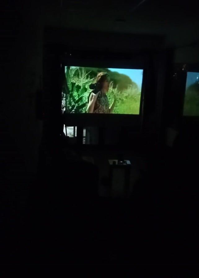 - "A dark room features a large television screen displaying a scene of a man and woman walking in a field" by FM-duVDN2, licensed under CC BY 4.0