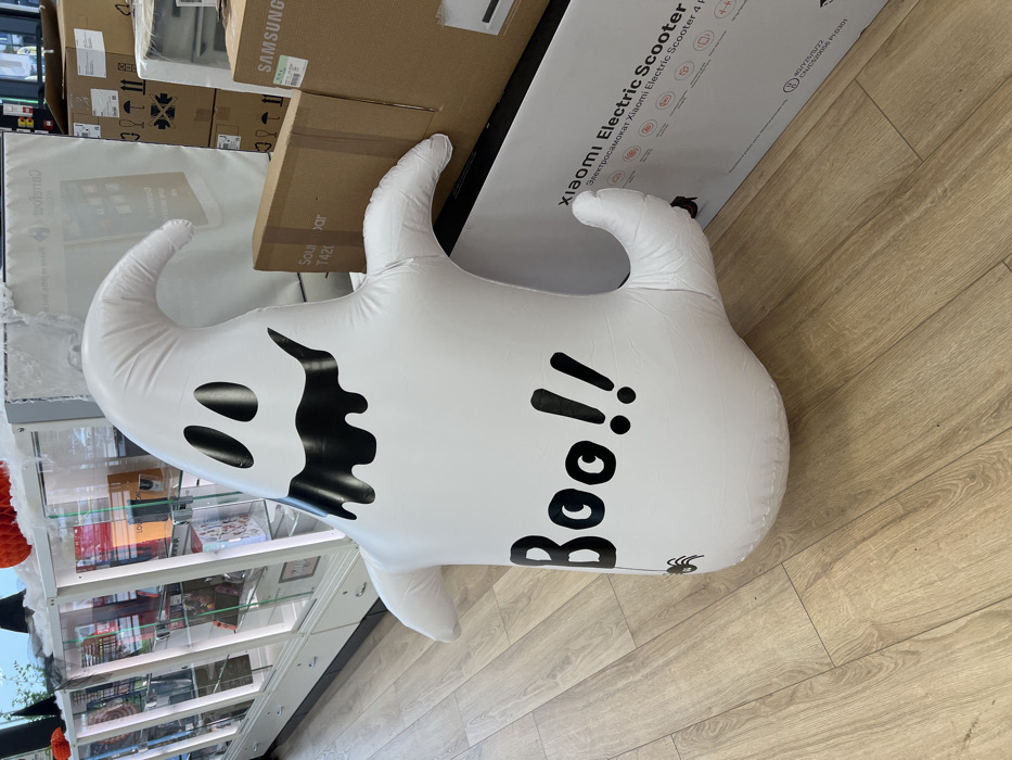 The image displays an interior retail scene, identifiable as a Carrefour hypermarket in Hérouville-Saint-Clair, France, based on a partial "Carrefour" logo visible on a white sign in the background. A large, white, inflatable Halloween ghost decoration stands prominently on a light wood-grain floor. The ghost features black oval eyes, a jagged black mouth, the printed text "Boo!!" in black, and a small black spider graphic near its base. To the left of the ghost, a row of illuminated glass display cases, framed in white, extends along a wall, showcasing various electronic devices and packaged goods. Above these cases, sparse Halloween decorations include a black witch's hat and an orange honeycomb paper lantern. To the right of the ghost, multiple cardboard boxes are stacked, with visible branding including "Sounbar T42i", "SAMSUNG", and "Xiaomi Electric Scooter 4 Pro". No individuals are present in the static scene.