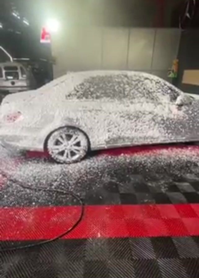 A silver car is covered in white foam in a garage or workshop. The car is a sedan. The foam covers the entire vehicle, including the tires. The floor has a checkerboard pattern in black and red. There's a coiled hose on the ground near the front tire. Other vehicles are partially visible in the background. The space is well-lit.