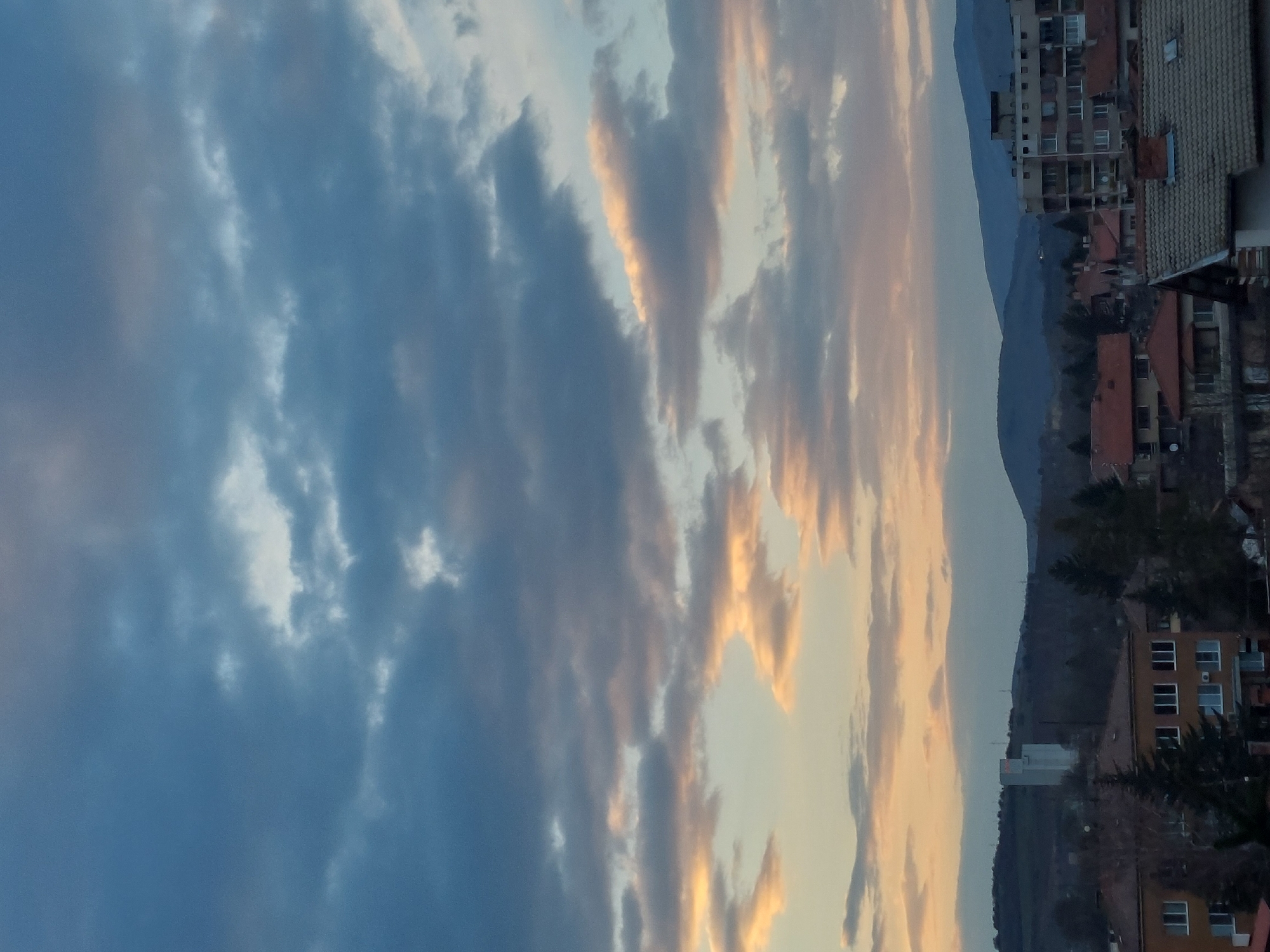 An elevated, static long shot depicts a segment of Slivnitsa, Bulgaria, at either sunrise or sunset. The upper two-thirds of the frame are filled with a sky exhibiting dense, dark blue-grey cloud cover in the upper strata, transitioning to lighter blue-grey with scattered clouds displaying golden-orange and pink coloration in the lower atmospheric layers. The lower third of the image presents the urban landscape against a backdrop of dark, undulating hills or mountains. Prominent in the midground, on the left, is a tall, slender, white rectangular structure, potentially a silo or water tower, featuring a red marking near its summit. To the right, multiple multi-story apartment buildings with visible windows and balconies are present. Scattered among these are smaller residential structures identifiable by their red-tiled roofs. Dark evergreen trees are interspersed throughout the urban area. No individuals are visible, and no discernible actions or interactions are depicted.