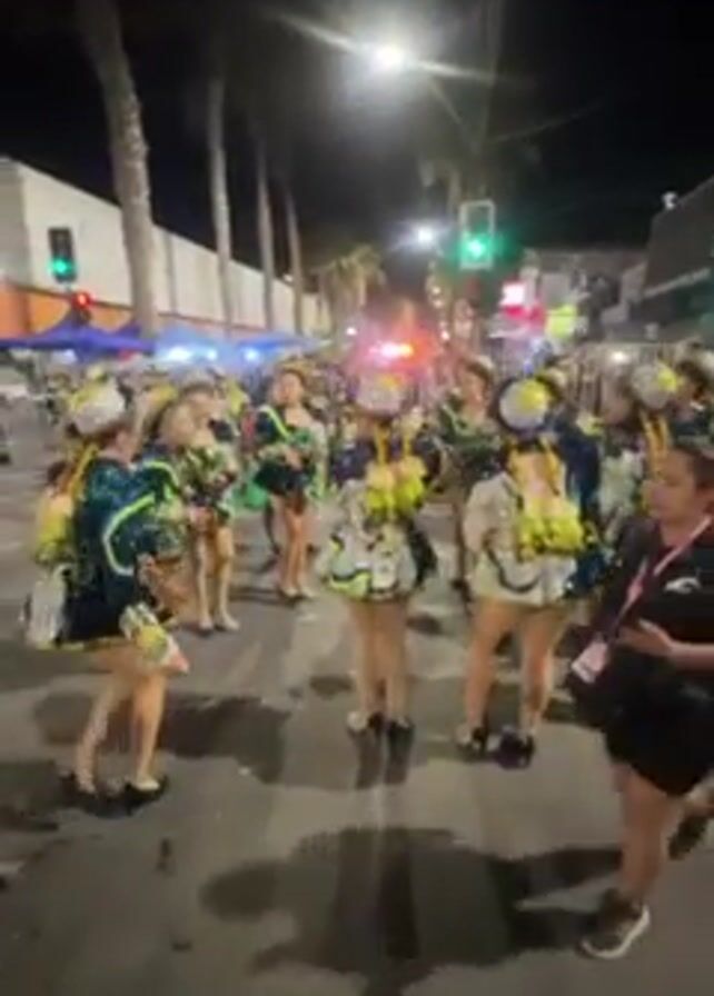 At night, a crowd of women in matching, elaborate costumes perform in a street. The women wear short, layered dresses that are heavily embellished with shiny fabrics, and ornate headwear. They wear dark shoes, and move rhythmically as a group in a dance or parade. A woman not in costume moves amongst them, seemingly taking photographs or video. The street is flanked by buildings and tall palm trees. Streetlights illuminate the scene, and traffic lights can be seen. In the background, there are hints of tents or temporary structures, and emergency vehicle lights.