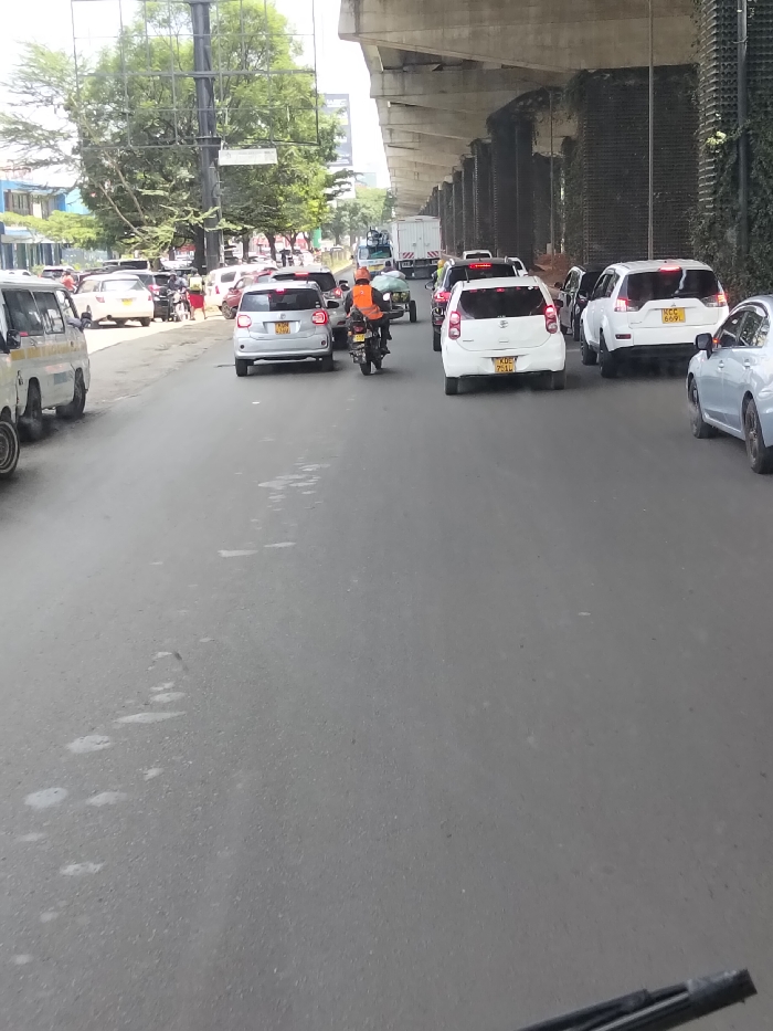 The image depicts a daytime scene of a multi-lane asphalt road experiencing moderate to heavy traffic congestion in Nairobi, Kenya