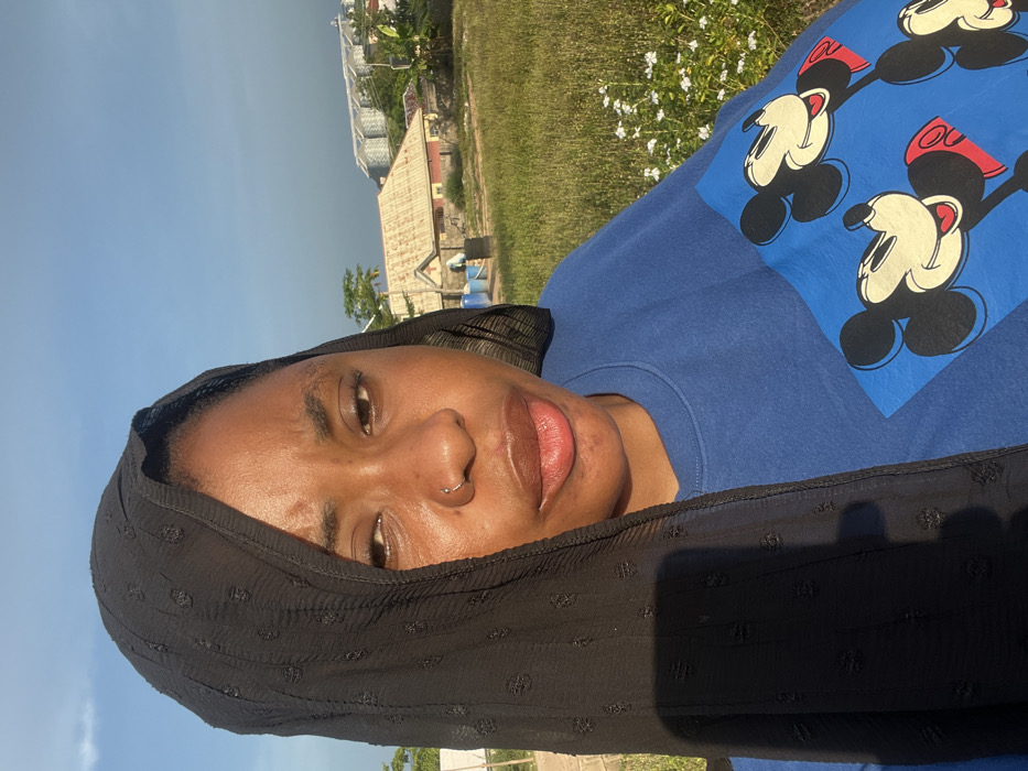 An adult female is depicted in a medium close-up shot in Zango-ndaji, Nigeria, under clear skies. She has a light brown complexion, a neutral facial expression with slightly parted lips, and a small silver nose ring in her left nostril. She wears a black sheer head covering, possibly a hijab, draped over her head and right shoulder. Her attire includes a blue long-sleeved shirt featuring a pattern of multiple Mickey Mouse characters on the front. Sunlight casts shadows, indicating an outdoor setting. The immediate foreground shows green grass with scattered small white flowers. In the background, a building with a reddish-brown corrugated roof and light-colored walls is visible, accompanied by several large silver cylindrical industrial silos or tanks in the distance. Sparse trees and vegetation are also present.