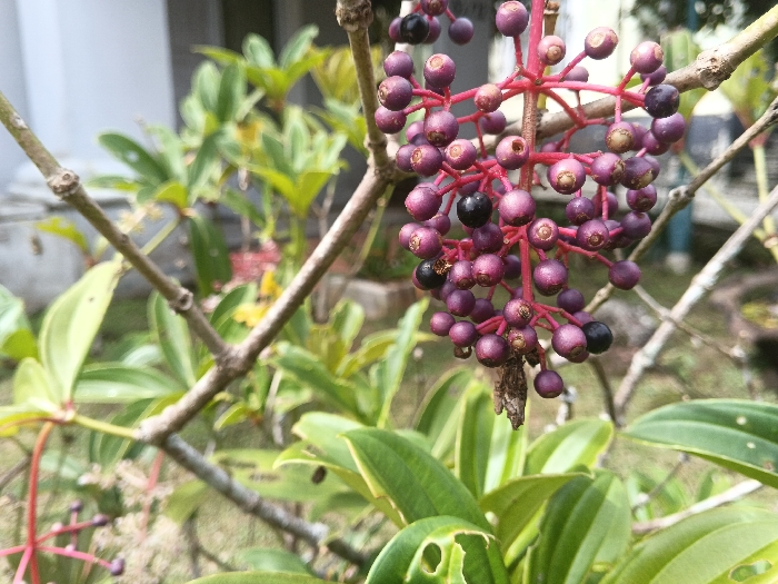 Clusters of dark purple and black berries with red stems hang from a branch. The berries are round and glossy, varying in size. Surrounding the berries are green leaves with light yellow edges, some exhibiting holes. The branch is light brown and slightly textured. In the blurred background, more greenery and a hint of white structure are visible.