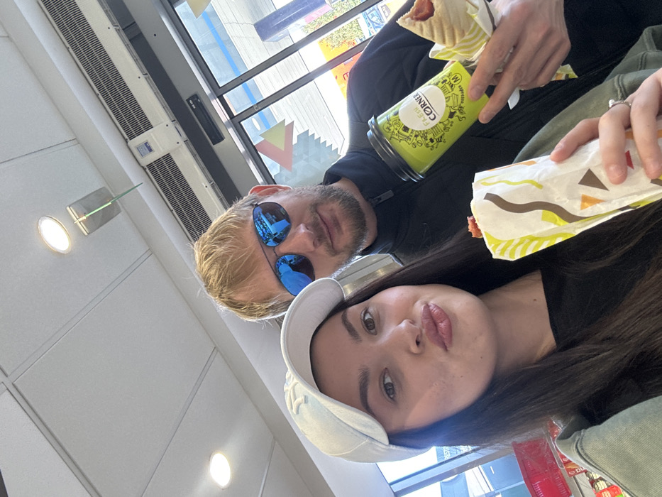 Two individuals are depicted posing inside a commercial establishment, likely a convenience store or gas station, located in Dub, Montenegro. In the foreground on the left, a young adult female with long dark hair, wearing a white baseball cap, dark top, and light-colored jacket, faces the camera with puckered lips. She holds a wrapped hot dog or similar item, showing a red filling, in her right hand. To her right and slightly behind, an adult male with short blonde hair and a beard, wearing reflective blue sunglasses and a dark zip-up jacket, looks at the camera with a subtle smile. He holds a green "Fresh Corner" branded coffee cup in his left hand and another wrapped food item, possibly a toasted sandwich, in his right hand, which also displays a red filling. The interior features a white tiled ceiling with circular recessed lights and horizontal air conditioning vents. Through the glass windows or doors in the background, abstract geometric decals in yellow, red, and light blue are visible, along with external reflections suggesting an outdoor commercial environment. A red shopping basket is partially visible on a shelf in the far left background.