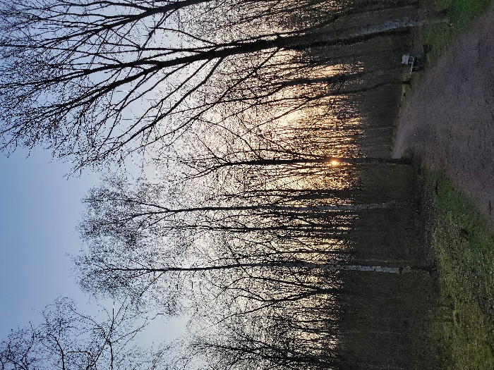 This image displays a wooded pathway at either sunrise or sunset in Ifs, France