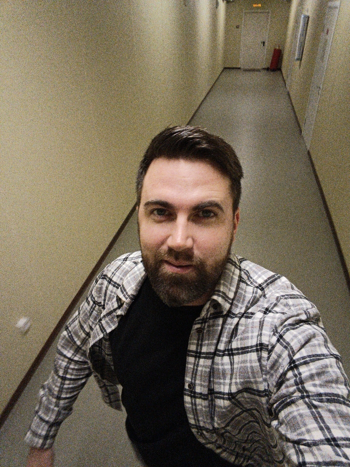- "A man with a beard stands in a hallway wearing a black t-shirt and a gray and white flannel shirt" by FM-YVp303, licensed under CC BY 4.0
