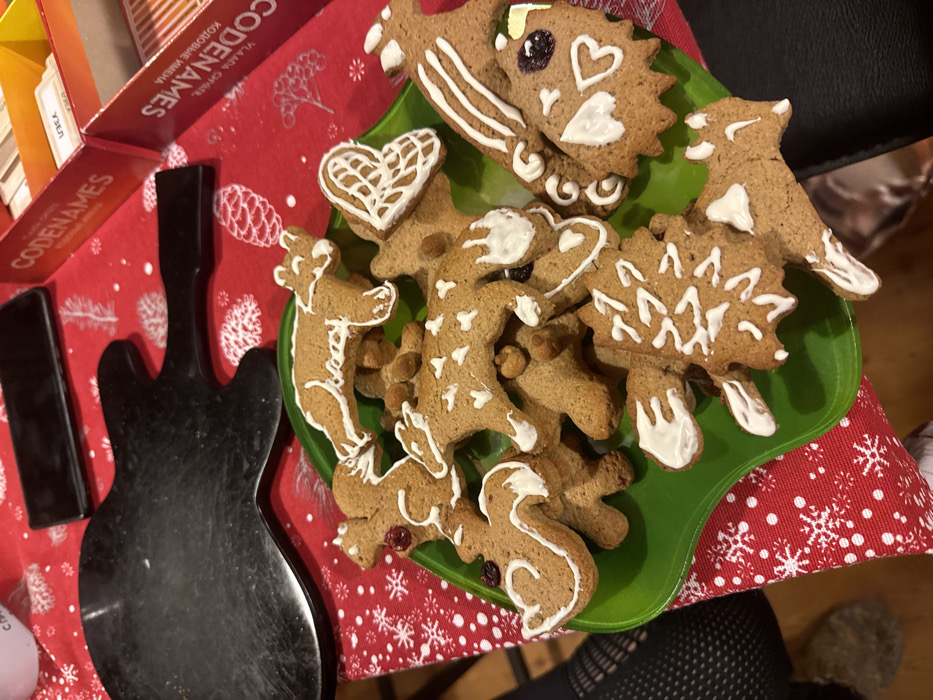 - "A festive scene shows a green plate piled high with gingerbread cookies of various shapes: bears, hearts, hedgehogs, a dragon, and other animals" by FM-iCO5W2, licensed under CC BY 4.0