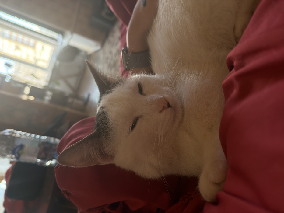 - "A white domestic cat with grey markings on its head rests on a red fabric surface, indicating a lap or bedding, within an indoor environment in Rostov-on-Don, Russia" by FM-D2wZf2, licensed under CC BY 4.0