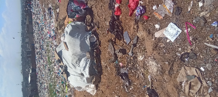 The scene depicts a vast landfill, identified as the Dandora Dumpsite in Nairobi, Kenya, under a hazy, overcast sky