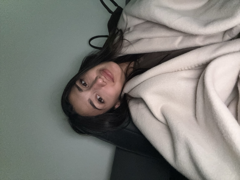 A young woman with long dark hair is partially covered by a soft, light-colored blanket, possibly fleece. She rests on a dark-colored surface, likely a couch or bed. Her face is visible, showing dark eyebrows and eyes, and a slight smile. The background features a plain, light-colored wall. A black strap is visible above her head, suggesting a bag or backpack. The image is taken with the camera rotated.