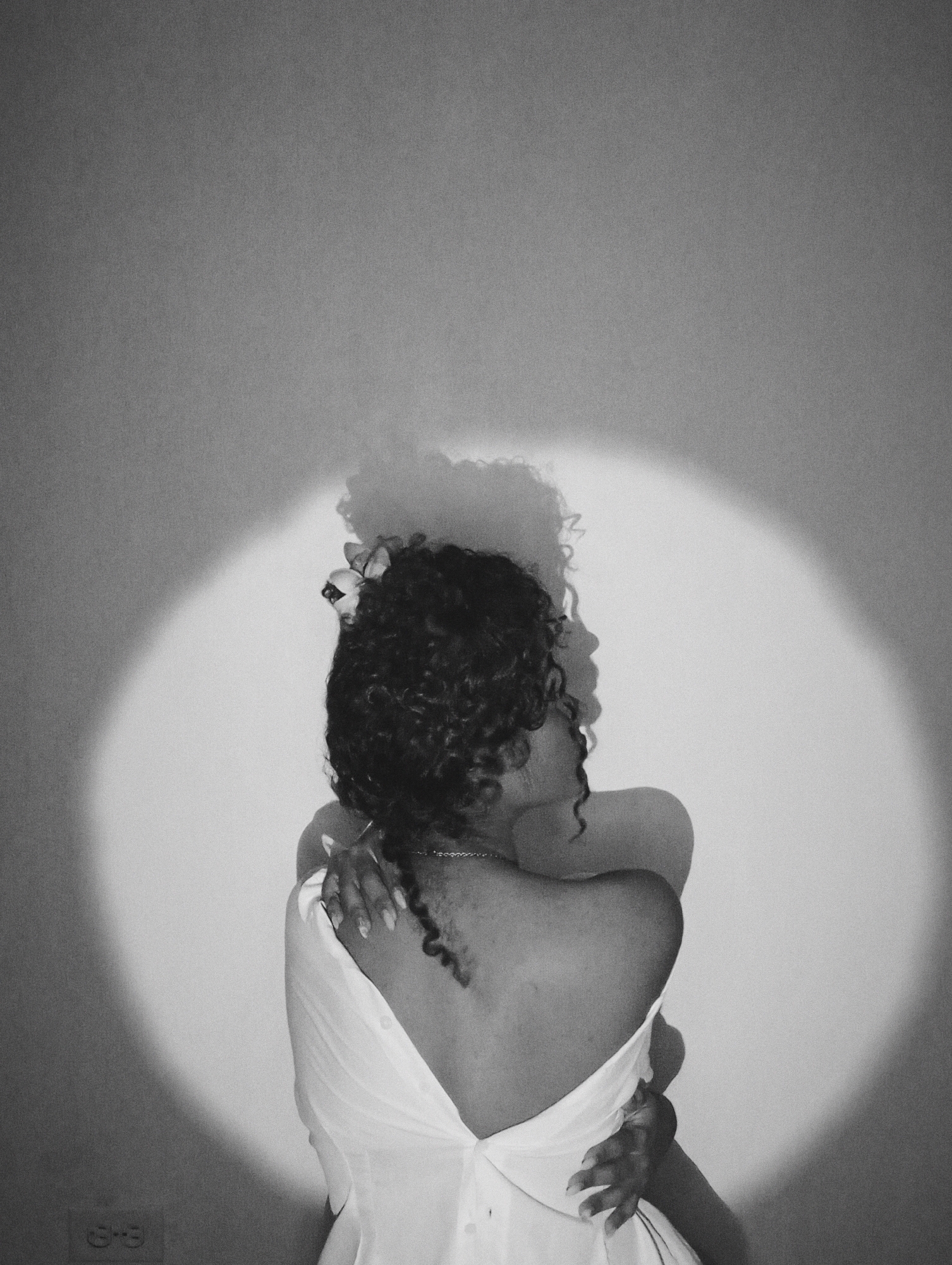 A black and white image depicts a woman from the back in a soft spotlight against a plain wall