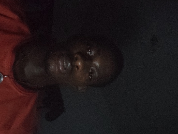 A dimly lit, rotated close-up photo of a person with dark skin, facing upwards. The individual wears a red top and a metallic necklace is visible. The background is dark, indistinct. Focus is primarily on the face, particularly the eyes and mouth, with some details obscured by shadows. The image appears to have been taken in low light conditions.