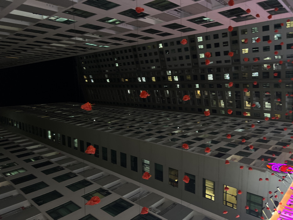 This is a nighttime, low-angle photograph taken in Nha Trang, Vietnam, depicting a dense urban environment. The scene is dominated by three tall, multi-story buildings that ascend towards a dark, clear sky. Two light-colored high-rise structures, likely residential or mixed-use, frame the left and right sides of the image, their numerous windows and balconies clearly visible. A third, darker building stands in the background, situated centrally between the two foreground structures. Hundreds of small, red, crumpled fabric objects, resembling decorative lanterns, are suspended on wires or strings at varying heights across the frame, forming an overhead canopy. Many windows on all visible buildings are illuminated from within, casting a warm, artificial light. A partial view of a bright pink and purple neon sign is visible at the bottom left, suggesting a commercial establishment at street level. No people are visible.