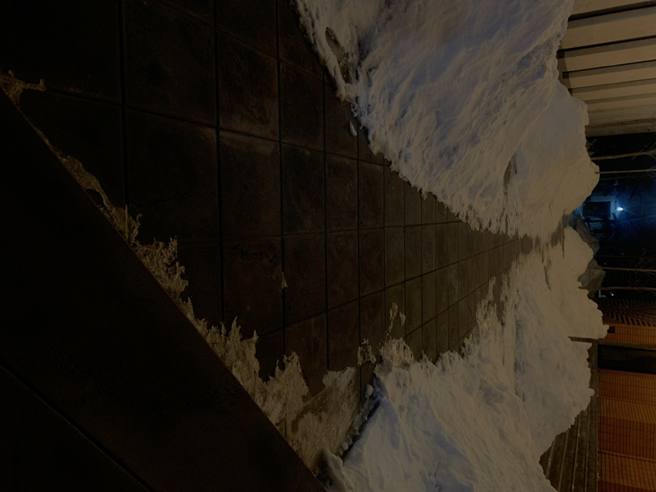 - "A dimly lit, tiled walkway is partially covered with snow" by FM-cuWTj1, licensed under CC BY 4.0