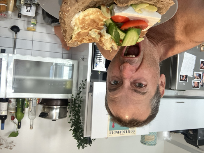 This image depicts a shirtless adult male in a residential kitchen located in the city of Givatayim, Israel