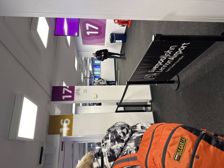This image depicts an interior scene within Liverpool John Lennon Airport in Liverpool, United Kingdom. The setting is a gate or queuing area with a dark grey carpeted floor and white walls. Overhead, multiple square white LED light panels illuminate the space. Two white columns in the mid-ground are prominently marked with gate numbers: "16" on a yellow background and "17" on a purple background. To the right, a large purple graphic on the wall displays "17" below a screen showing a purple image. Black retractable belt stanchions form a queue line, with a black banner positioned in the mid-ground. This banner features the "Liverpool John Lennon Airport" logo and the motto "Faster. Easier. Friendlier." Three individuals are visible. In the immediate foreground, a person is seen from the chest down, from behind. They are wearing a black and white patterned jacket and an orange backpack adorned with a "BULGARIA" flag patch. Their light-colored hair is visible above their shoulders. In the mid-ground, to the right, a bald man in a dark jacket, dark trousers, and dark shoes stands looking down at a mobile phone held in both hands. Further back and slightly to the left, another man in a light-colored hooded jacket is partially visible, facing towards the right. A blue waste bin with a grey lid and a red wall-mounted fire extinguisher are present on the right side of the scene. In the background, beyond an open area, windows or panels reveal bright blue and white light, suggesting an exterior view or another part of the terminal.