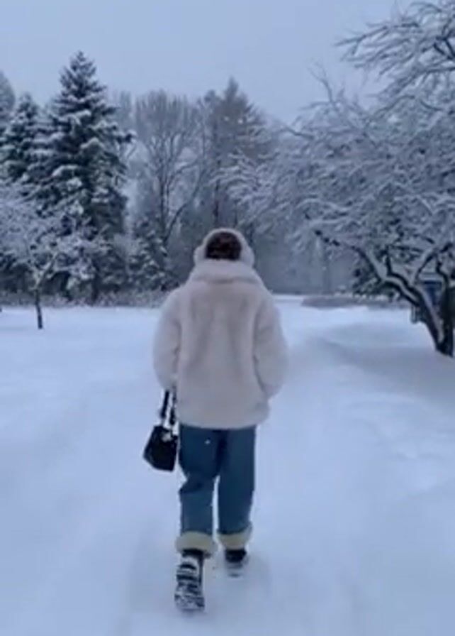 A single person walks away from the camera on a snow-covered path. They are wearing a white fur coat, blue jeans, and snow boots with fur trim. They carry a black purse. The environment is a snowy park with snow-covered trees. The sky is overcast.