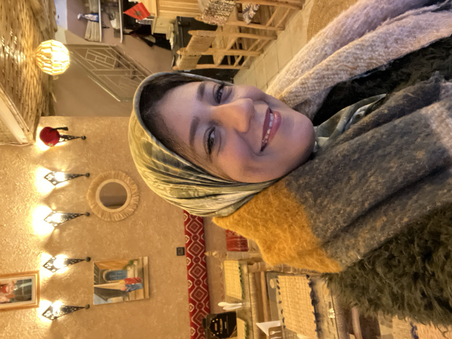 A smiling woman wearing a headscarf and a thick, multi-toned scarf poses indoors. The room has decorative wall lighting and paintings. A round mirror hangs on the wall. Woven chairs and mats are visible, suggesting a restaurant or cafe. A Moroccan flag appears in the background. The woman's face is well-lit, and she looks directly at the camera.
