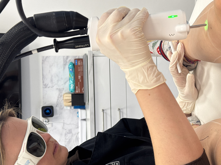 A person wearing safety glasses and a black shirt is seen holding a Lutronic laser device with gloved hands, treating a patient's underarm area