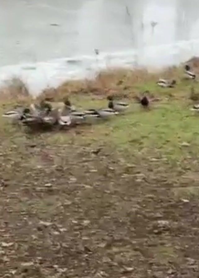 The camera pans across a scene featuring a partially frozen lake with a group of ducks on the grassy bank