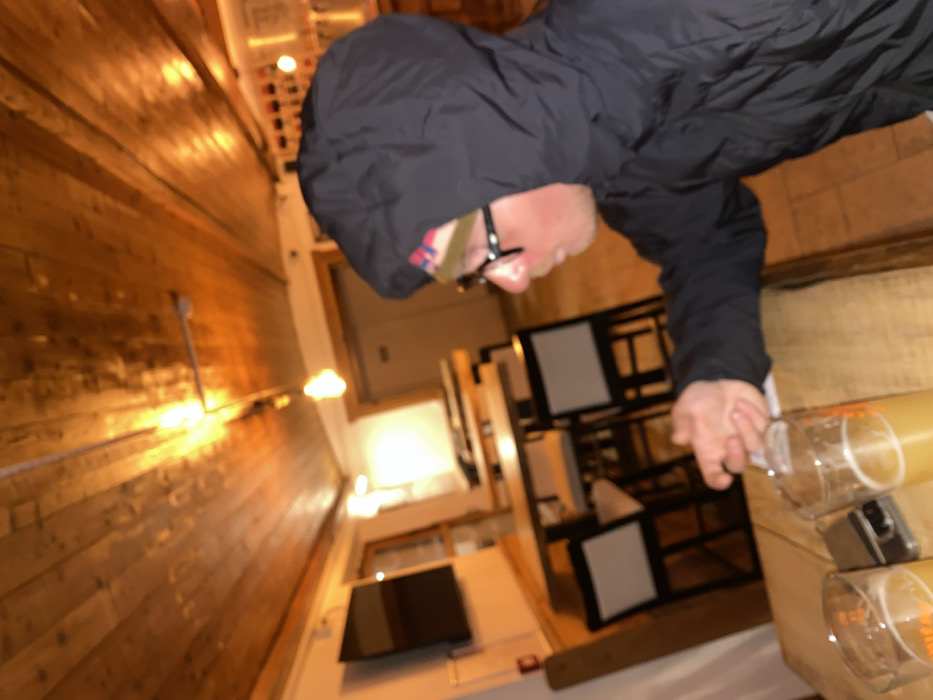 The scene depicts the interior of a commercial establishment, possibly a bar or restaurant, in Briançon, France. No specific identifying markers for the exact venue are visible. The image is blurry with warm, artificial lighting. On the right side of the frame, a person is seated at a light-colored wooden table with a rustic edge. This individual wears a dark, possibly black, hooded jacket with the hood up, obscuring most of their hair. A multicolored beanie with pink patterning is visible beneath the hood. They wear dark-framed glasses, and their right cheek appears flushed. Their right arm is extended, with the hand reaching towards or gesturing near items on the table. On the wooden table, two clear glasses containing a light amber or pale yellow liquid are present, consistent with beer. A dark, rectangular object, possibly a smartphone or wallet, lies on the table between the two glasses. The background shows additional light-colored high-top tables paired with stools featuring dark frames and light-colored square seats. A flat-screen television is mounted on a white wall in the upper-left quadrant. Multiple bare Edison-style light bulbs provide warm, orange-toned illumination, one hanging centrally, others part of a track lighting system. The ceiling is constructed from horizontal wooden planks. The floor appears to be tiled. A light-colored doorway is visible in the background, along with another, darker entrance or structure.