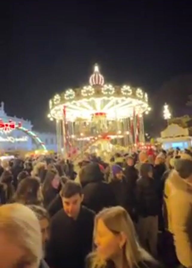 crowded outdoor scene at night, likely a Christmas market. A brightly lit carousel is the focal point, surrounded by people of various ages dressed in winter clothing. Many are holding cups, possibly with warm drinks. The background features illuminated buildings and other festive decorations. The camera seems to be held by someone walking through the crowd.