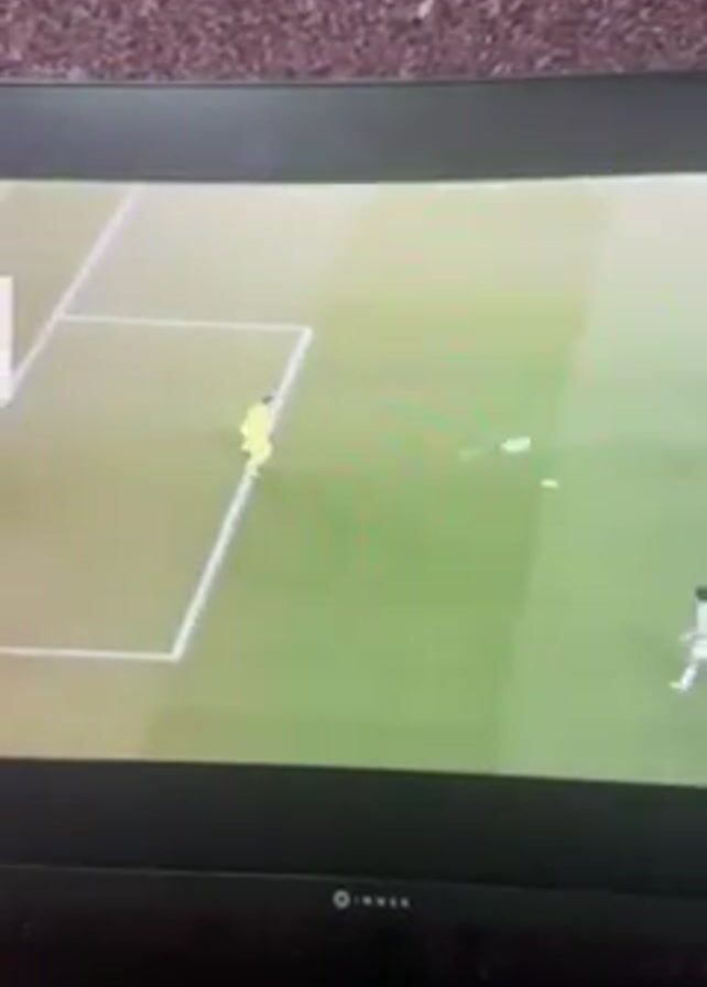 The video displays a TV screen. The initial frame shows a soccer match. Two players, one in a red and blue uniform and the other in a white uniform, are facing each other on a green field, with other players visible in the background. The camera angle shifts to a wider shot of the field, showing more players in red and white versus blue and white uniforms. Then, the scene transitions to a black and white shot of a person walking down a hallway, wearing a blue jacket, headphones, and a backpack. They are followed by other people, including a woman in a yellow jacket. The camera focuses on the person's back as they continue walking.