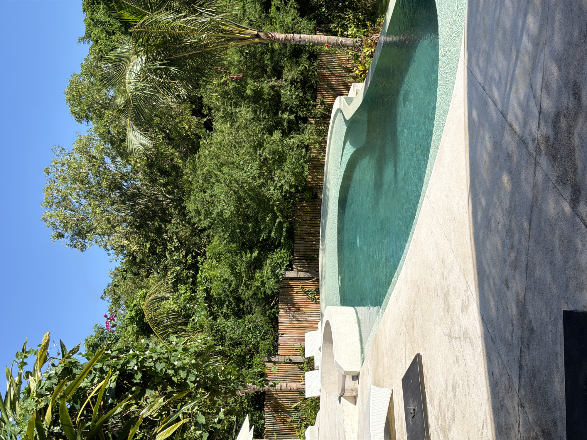 The scene captures a swimming pool located in Uluwatu, Indonesia, bordered by lush tropical foliage and a clear blue sky. The pool is turquoise in color, surrounded by light beige textured tiling and white seating structures. A bamboo fence separates the pool area from the dense green vegetation, including various trees and shrubs. The sunlight casts shadows across the scene, enhancing the textures of the tiled surfaces.