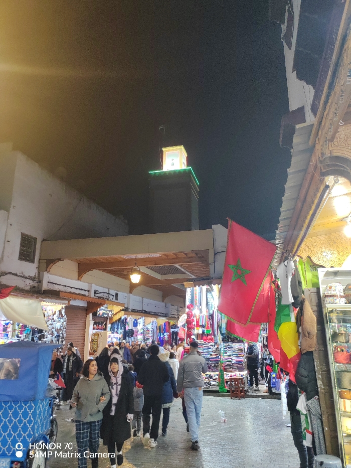 A bustling marketplace at night, filled with people browsing various goods. Moroccan flags are visible, adding to the cultural atmosphere. A clock tower stands tall above the surrounding buildings, illuminated against the dark sky. Shops are open with bright lights.