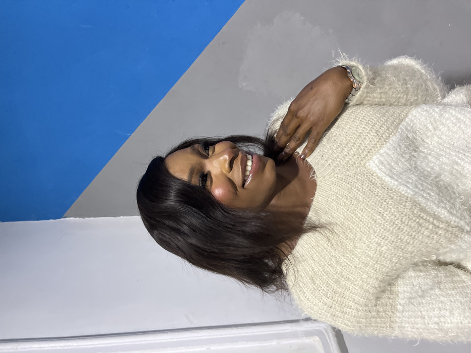 A woman with dark hair and a radiant smile poses in a cozy, off-white sweater. Her right hand rests near her neck, adorned with a colorful bracelet. She gazes upwards, seemingly lost in thought. The background consists of a wall painted in a modern, geometric pattern of blue, gray, and white, providing a stark contrast to her warm-toned complexion and fluffy sweater.