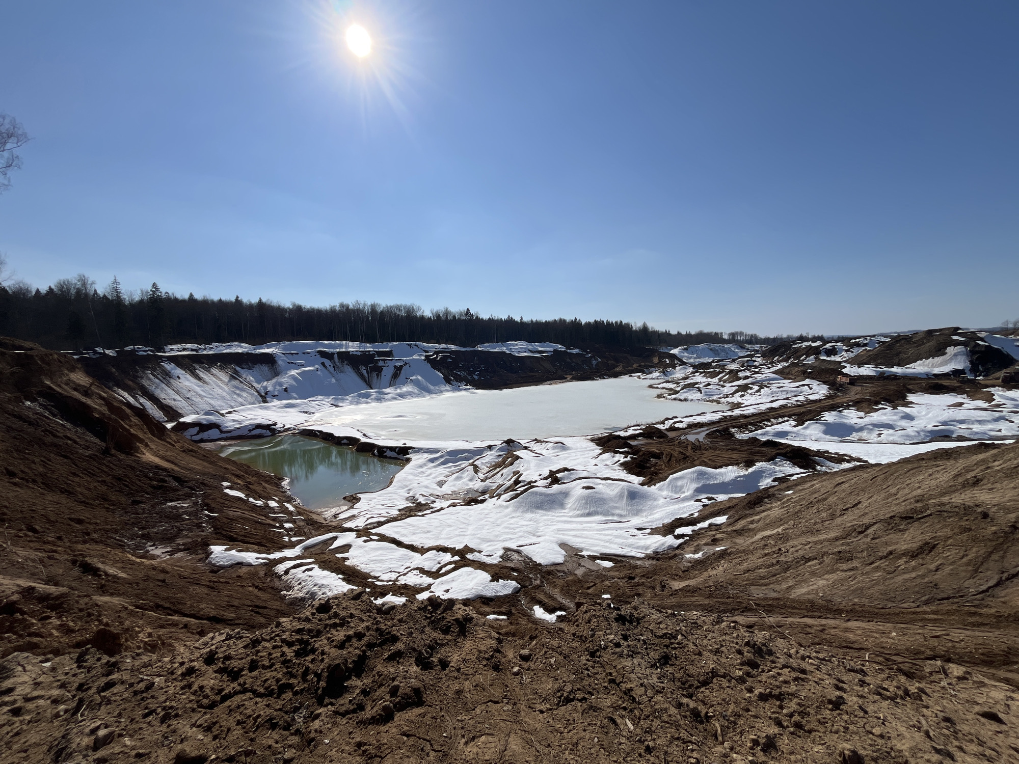 The image depicts an open-pit landscape in Ivlevo, Russia, under a clear blue sky with a brilliant sun in the upper left quadrant. The scene is characterized by extensive, reddish-brown excavated earth and spoil piles, indicative of a quarry or sand/gravel extraction site. Patches of melting white snow are distributed across the brown terrain and slopes. A large body of water occupies the central and mid-ground, mostly covered by a flat, white icy surface. A smaller, adjacent pool of unfrozen, greenish water is visible on the left side of the main ice sheet. In the distant background, a dense treeline of mixed deciduous and coniferous trees forms a dark horizon. A small, light-colored vehicle or structure is faintly discernible in the mid-ground, positioned near the edge of a snow patch on the right side of the frozen water. No individuals are present.