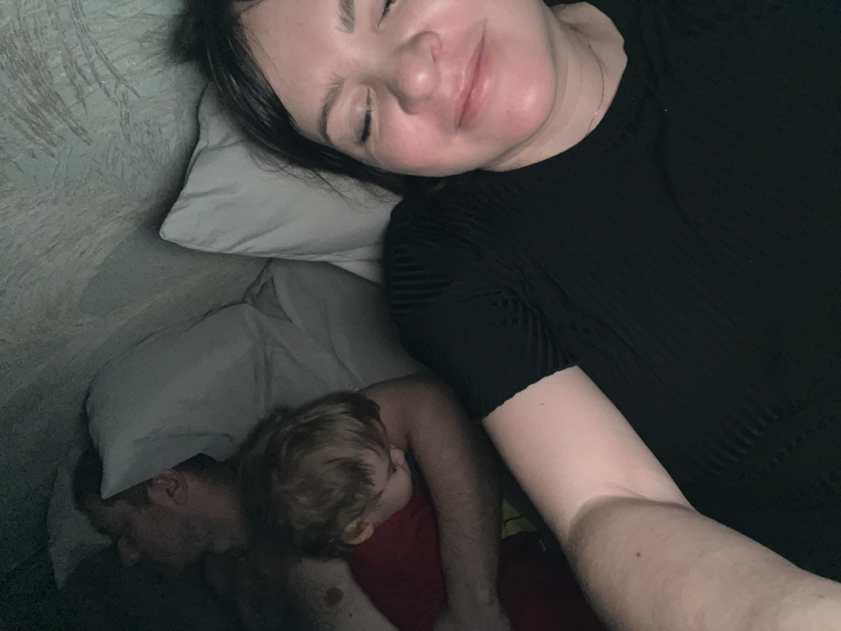 A woman with dark hair lies on a pillow, eyes closed. Beside her, two other people, likely children or a child and an adult, also sleep. One is wearing a red shirt. The scene is dimly lit, suggesting it may be nap time or nighttime. The woman is wearing a black shirt and appears to be content. All are on a bed with grey pillows and light green wallpaper.
