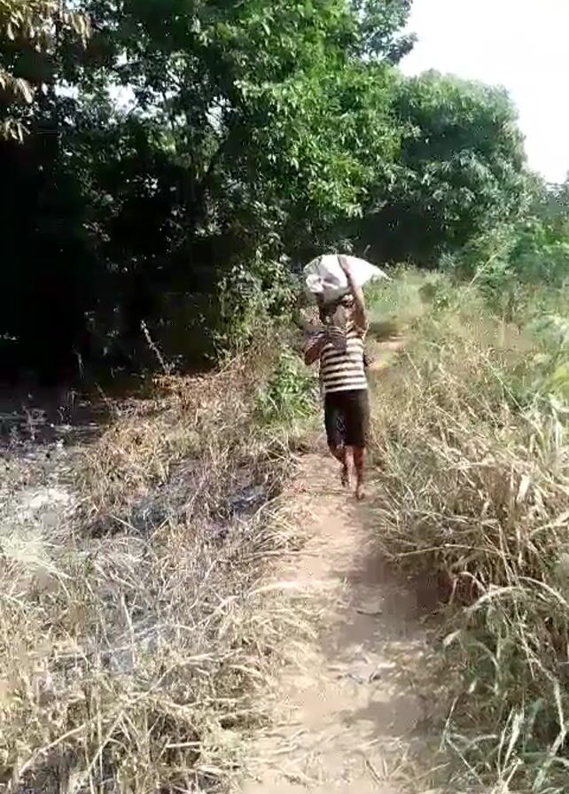 three people carrying large bags on their heads while walking along a narrow dirt path. The person in the front is wearing a striped shirt and a dark skirt. The second person is wearing a patterned shirt and patterned shorts. The third person, who is in the background, is wearing a striped shirt and dark shorts. The path is bordered by tall, dry grass on one side and a burned area with trees on the other. The sky is bright, suggesting it is daytime. The camera appears to be held by someone walking behind the first person.