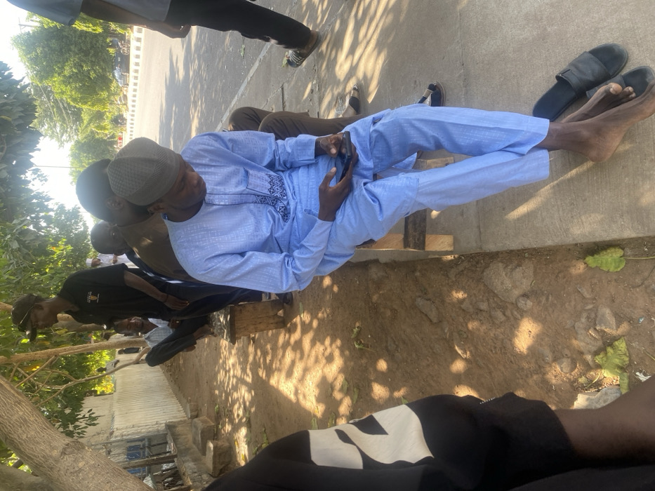 The image depicts an outdoor daytime scene in Unguwar Sarki, Nigeria, featuring multiple individuals along a dirt pathway adjacent to a paved road. In the foreground, a male individual is seated on a light-colored wooden bench. He wears a light blue embroidered kaftan and a grey kufi cap, and is barefoot, operating a black smartphone with both hands while looking down. A pair of black sandals rests on the ground beside his feet. Behind him, another male in a brown shirt is partially visible, also seated. Further left, a male in a black t-shirt and dark cap, with sunglasses perched on his head, stands, facing right. Behind him, another individual in a light-colored shirt is seated on a wooden bench. The ground is reddish-brown dirt, scattered with small rocks and dried leaves, exhibiting dappled sunlight and shadows from overhead trees. A light-colored wall runs along the left side. To the right, a paved asphalt road with a raised curb is visible, with distant vehicles and individuals. On the immediate right, the lower legs of a person in dark pants and striped sandals are visible, walking on the paved surface.