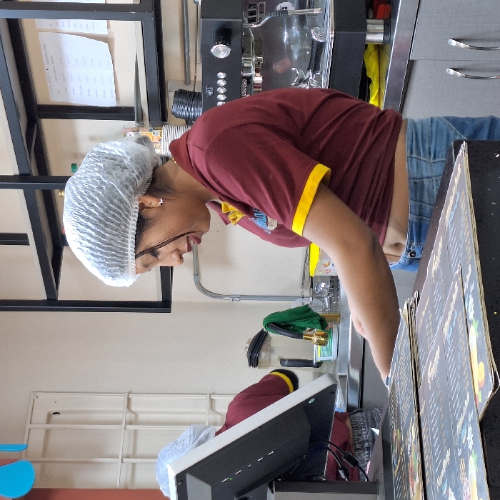 - "A woman in a hairnet and maroon shirt leans over a counter, possibly reading a menu or operating a point-of-sale system" by FM-b0Aw43, licensed under CC BY 4.0