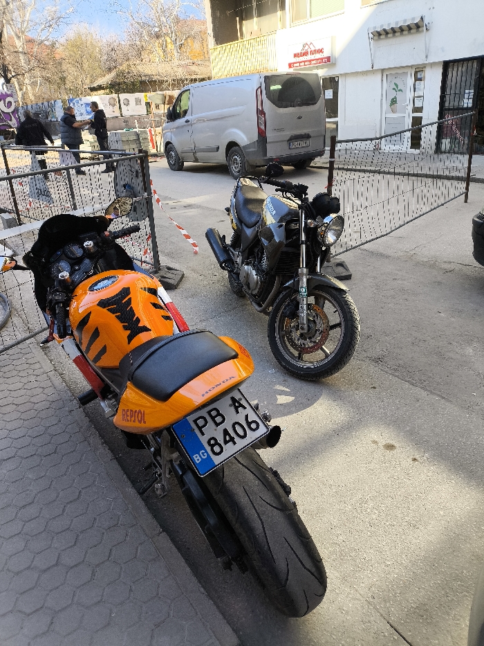 The image displays an urban street scene in Plovdiv, Bulgaria. In the immediate foreground, an orange Honda Repsol sport motorcycle with a black seat and "Repsol" branding is parked on a gray hexagonal paver sidewalk. Its Bulgarian license plate, "PB A 8406," is clearly visible at the rear. Adjacent to it, on the asphalt road, a black Honda naked motorcycle with a round headlight and "Honda" branding is parked, facing the viewer. Behind the motorcycles, a silver Ford Transit cargo van is parked on the asphalt road, facing away from the viewer. Its rear license plate is partially obscured. Temporary metal barriers, some wrapped with red and white striped tape, delineate areas of the street and sidewalk. To the left, behind these barriers, three individuals are visible, appearing to converse amidst stacks of light-colored construction pavers or bricks. To the right, a white two-story building features a sign in Cyrillic, "МЕДИА ПЛЮС" (MEDIA PLYUS), above its entrance, which also displays a green plant decal. Bare trees are visible in the background against a clear, bright sky. The scene is illuminated by natural daylight, casting shadows on the ground.